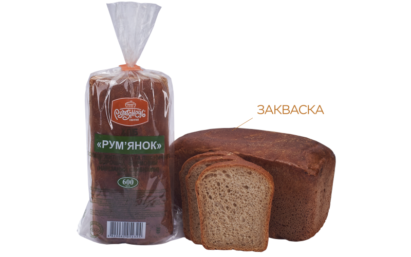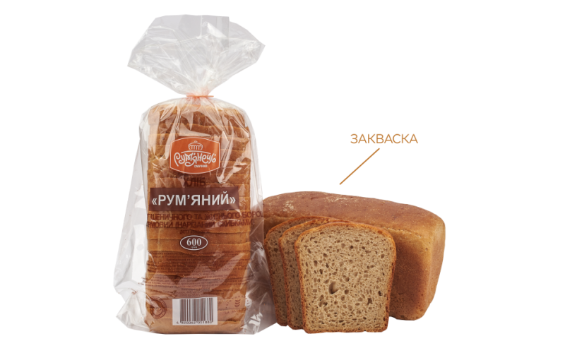 Наш авторський і один з ваших улюблених житньо-пшеничних хлібів. У ньому ми поєднали пшеничне борошно другого сорту та житнє обдирне борошно. Це не лише по-особливому смачно, а й дуже корисно. Жива житня закваска допомагає розкрити всю користь міксу борошна, а ще – підсилює ніжний житньо-пшеничний аромат і робить хлібний м’якуш повітряно-легким. Ми не випадково обрали форму цеглинки для цього хліба. Завдяки випіканню у формі хлібна скоринка виходить тоненькою та рум’яною. Справжній «Рум’яний» хліб від ТМ «Рум’янець».