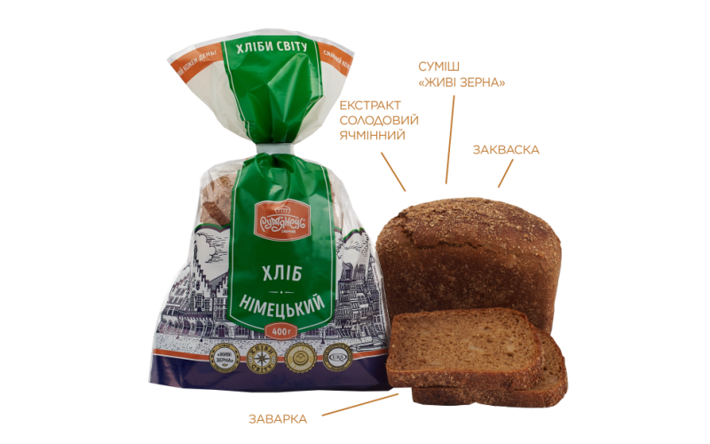 Хліб за автентичною німецькою рецептурою просто не міг не потрапити до нашої колекції «Хліби світ». Німці також обожнюють хліб, тож мають велику кількість рецептів – ми обрали особливий. Наш «Німецький» – житньо-пшеничний, виготовлений з додаванням заварки та живої житньої закваски. Німецький характер цього хліба криється саме у додаванні «живих зерен» (крупа перлова, ядро насіння соняшника, житнє цільнозернове борошно, житні висівки). Солодово-ячмінний екстракт, не лише підвищує корисні властивості цього хліба, а й довершує смакову композицію легкими солодкуватими нотками.