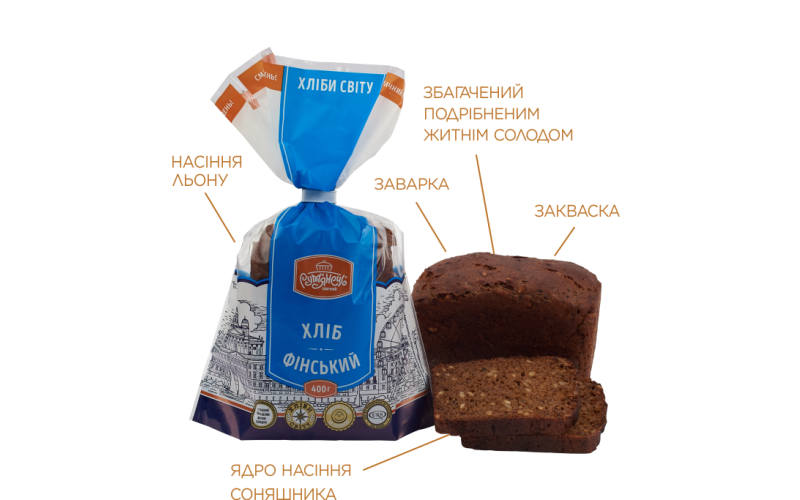 Найпівнічніша рецецептура у нашій колекці «Хліби світу». Житньо-пшеничний заварний хліб, виготовлений на живій житній заквасці, яка є обов’язковою для традиційного фінського хліба. Окрім того, для фінської кухні важливою є висока поживна цінність продуктів, саме тому ми збагатили свій «Фінський» насінням соняшника, подрібненим житнім солодом та насінням льону. Такий хліб не лише дуже корисний, а й має яскравий нордичний хлібний смак.
