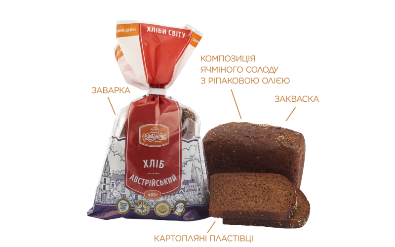 Спробуйте хліб за класичною австрійською рецептурою з нашої особливої колекції «Хліби світу». Традиційний високорецептурний житньо-пшеничний хліб, виготовлений на житній заварці та живій житній заквасці. Особливих шляхетних ноток смаку нашого «Австрійського» надає композиція ячмінного солоду та ріпакової олії.Завдяки натуральному тростинному сиропу «Лейпомо» цей хліб злегка солодкуватий, тож чудово підійде для канапок на сніданок з ароматною віденською кавою.
