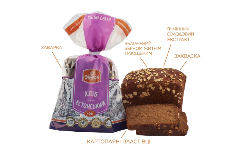Скоштуйте хліб «Естонський» з нашої особливої колекції «Хліби світу». Справжній житньо-пшеничний заварний хліб, виготовлений на живій житній заквасці. Збагачений житнім плющеним зерном, адже жито – основа естонських хлібів. Щоб підкреслити його балтійський характер, ми додаємо у цей хліб картопляні пластівці, бо картопля вважається одним із основних продуктів естонського столу. Ячмінний солодовий екстракт і натуральний тростинний сироп «Лейпомо» надають смаку нашого «Естонського» шляхетної солодкуватої нотки.
