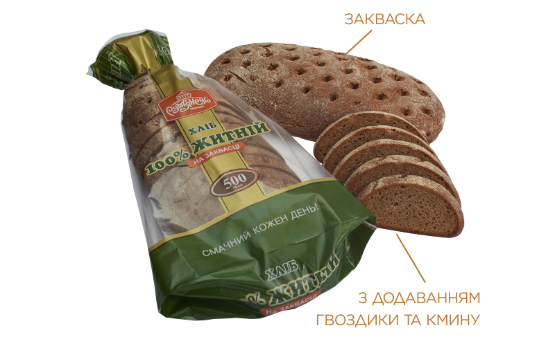 Справжній житній хліб виготовлений з житнього обдирного борошна. Ми робимо цей хліб на живій житній заквасці, яка допомагає розкрити усі корисні властивості житнього хліба. Наш «100% житній» має щільний дещо вологий м’якуш та насичений житній смак з легкою кислинкою, яку вдало доповнюють пряні нотки гвоздики та кмину.
