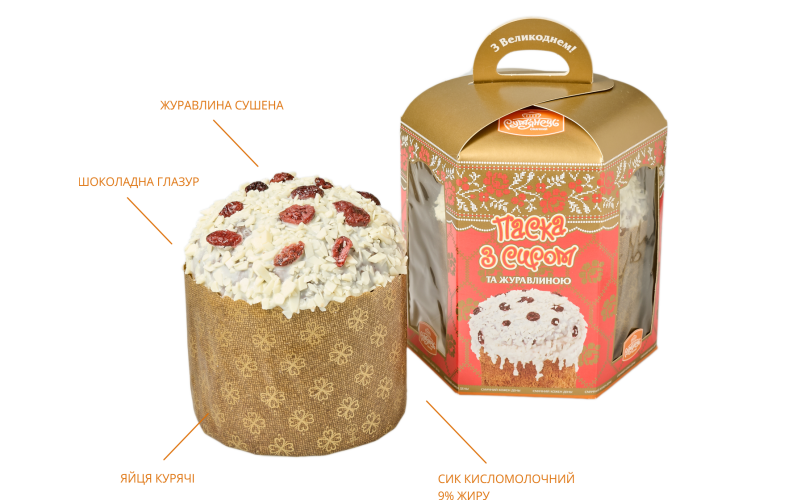 Завдяки додаванню смачного свіженького сиру в тісто ця паска має щільний м’якуш з ніжними вершковим смаком. Легка кислинка журавлини урівноважує солоденький смак сирної паски. Для оздоби ми використовуємо білу шоколадну глазур, ніжні шоколадні крихти та ягідки журавлини, які додають яскравих акцентів.