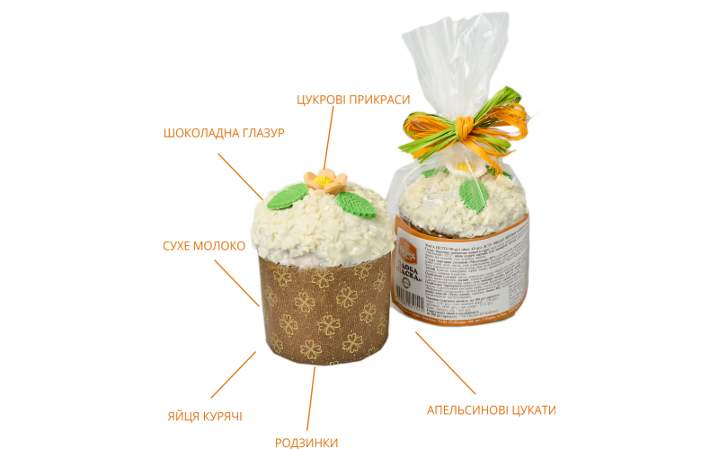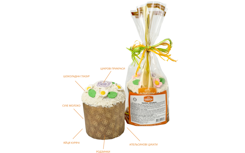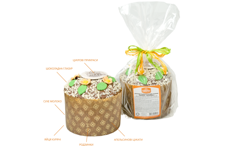 Паска, яка смакує по-домашньому, адже ми виготовляємо її за традиційною рецептурою. Вона має ніжний м’якуш з легким вершковим смаком. Яскравих акцентів додають апельсинові цукати, які увиразнюють смак легкими кисло-солодкими нотками. Для оздоби ми використали смачну глазур з чорного шоколаду, білі шоколадні крихти та цукрові квіти, ніжні як сама весна.