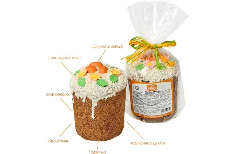 Паска, яка смакує по-домашньому, адже ми виготовляємо її за традиційною рецептурою. Вона має ніжний м’якуш з легким вершковим смаком. Яскравих акцентів додають апельсинові цукати, які увиразнюють смак легкими кисло-солодкими нотками. Для оздоби ми використали смачну глазур з білого шоколаду, яскраві шоколадні крашанки та цукрові квіти, ніжні як сама весна.