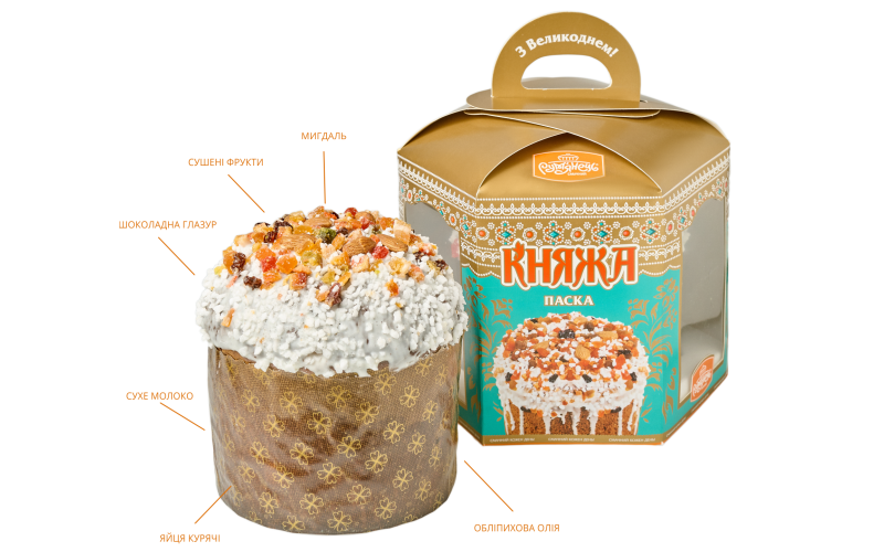Завдяки оригінальній рецептурі та особливій комбінації інгредієнтів наша «Княжа» має справді багатий вишуканий смак. Пухкий м’якуш з ніжним вершковим смаком, щедро наповнений цукатами, родзинками і сухофруктами. Щоб надати смаковому звучанню особливих ноток, ми додаємо у цю паску трішки обліпихової олії. Пишну оздобу робимо з білої шоколадної глазурі. Прикрашаємо маківку паски смачними цукатами та мигдалем, який додає їй благородного смаку. Справжня «Княжа» паска!
