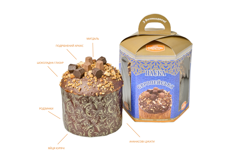 Паска з оригінальним вишуканим смаком. Пишне м’яке тісто з легкими вдало доповнюють ананасові цукати та родзинки. Скуштувавши шматочок, ви відчуєте легкі нотки ванілі та апельсину, які вдало доповнюють смак. Оздоба паски, з чорної шоколадної глазурі у поєднанні з шматочками подрібненого мигдалю, створює яскраві смакові акценти. Вишукані цукерки з чорного та молочного шоколаду ідеально довершують образ великодньої «Європейської».