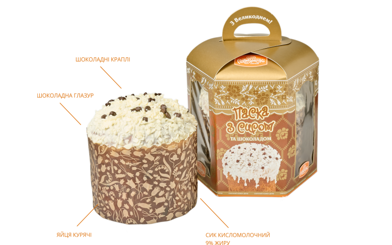 Паска з довершеним поєднанням смаків. Ніжна сиркова текстура пухкенького м’якуша паски з яскравими шоколадними акцентами. Завдяки балансу інгредієнтів, ця паска має вишуканий смак та ніжний ванільно-шоколадний аромат. Оздоба з білої шоколадної глазурі з краплями з чорного шоколаду довершує образ паски «З сиром та шоколадом».