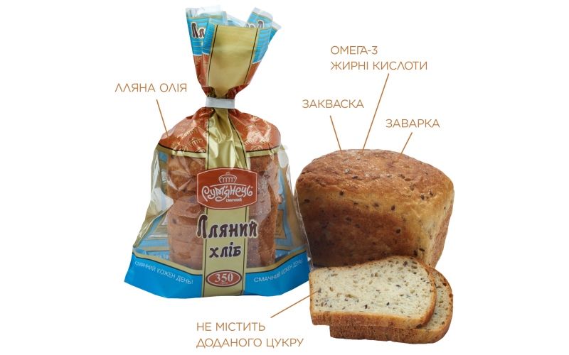 Справжній заварний пшеничний хліб зробити ще кориснішим і смачнішим, якщо додати зернятка льону. Саме так з’явився наш хліб «Лляний» – улюбленець прихильників здорового харчування. Завдяки заварці цей хліб повністю розкриває природні корисні властивості якісного пшеничного борошна першого сорту. Він має надзвичайний духмяний аромат та солодкуватий присмак, хоч і взагалі не містить доданого цукру. Насіння льону, яке ми щедро додаємо до цього хліба, збагачує його омега-з жирними кислотами та створює яскраві смакові акценти.
