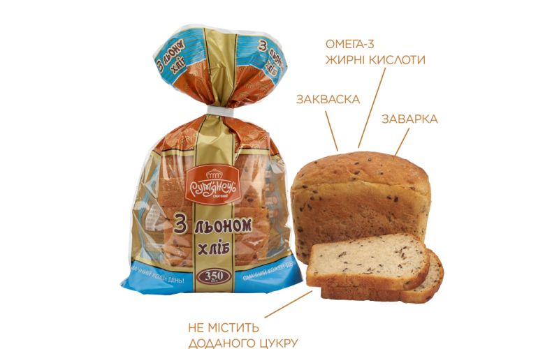 Справжній заварний пшеничний хліб зробити ще кориснішим і смачнішим, якщо додати зернятка льону. Саме так з’явився наш хліб «З льоном» – улюбленець прихильників здорового харчування. Завдяки заварці цей хліб повністю розкриває природні корисні властивості якісного пшеничного борошна першого сорту. Він має надзвичайний духмяний аромат та солодкуватий присмак, хоч і взагалі не містить доданого цукру. Насіння льону, яке ми щедро додаємо до цього хліба, збагачує його омега-з жирними кислотами та створює яскраві смакові акценти.