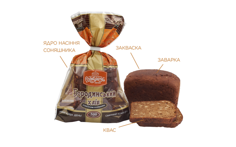 Завдяки додаванню закваски, заварки і квасу власного виробництва «Бородинський з насінням соняшника» має щільну пористу дещо вологу м’якушку та яскравий житній смак з легкими солодкими ноткам. Щедро наповнений цілими зернятками соняшника, цей хліб має особливе смакове звучання й додаткові корисні властивості.