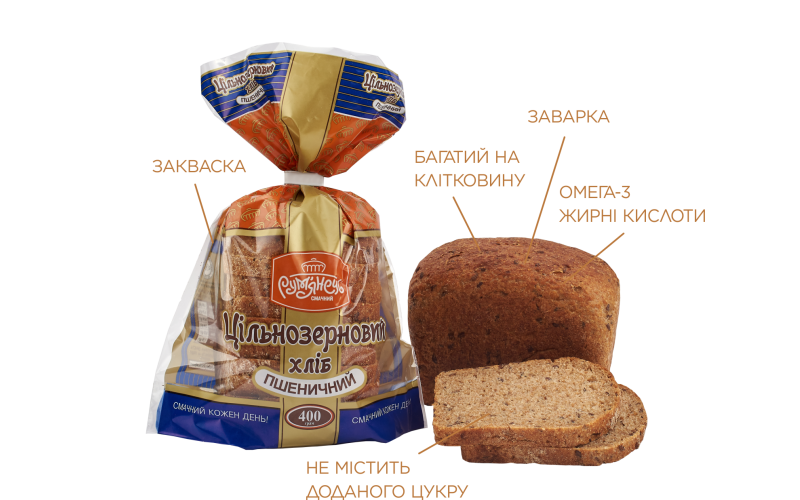 Ідеальна рецептура для прихильників здорового харчування. Виготовлений з пшеничного цільнозернового борошна на заквасці та заварці. Завдяки додаванню насіння льону, наш «Цільнозерновий» також містить Омега-3 жирні кислоти. Цей хліб багатий на клітковину й має невисоку калорійність, тож чудово доповнить будь-який здоровий раціон.
