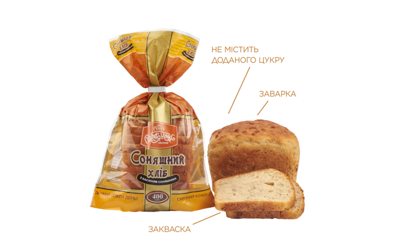 Заварний пшеничний хліб щедро наповнений ціленькими ядрами насіння соняшника. Цей хліб не містить доданого цукру, проте має солоденький присмак, завдяки заварці. Вона розкриває увесь природній смак якісного пшеничного борошна, робить хліб пухким і ароматним. Золота пшениця та насіння соняшника, що увібрали в себе тепло промінців літнього сонця – саме такий склад має справжній соняшний хліб.