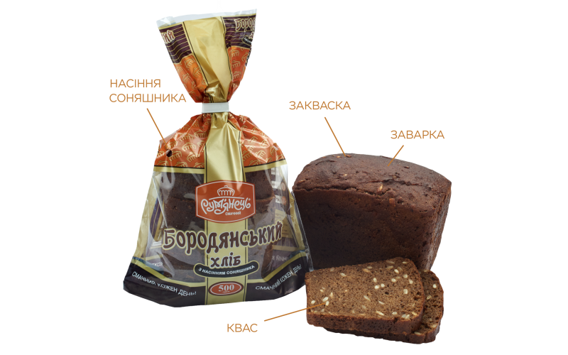 Завдяки додаванню закваски, заварки і квасу власного виробництва «Бородянський з насінням соняшника» має щільну пористу дещо вологу м’якушку та яскравий житній смак з легкими солодкими ноткам. Щедро наповнений цілими зернятками соняшника, цей хліб має особливе смакове звучання й додаткові корисні властивості.