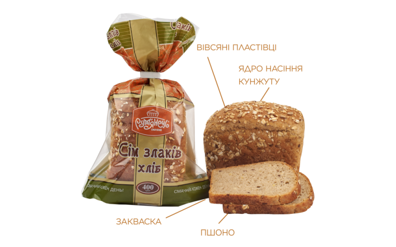 Суміш пшеничного та житнього обдирного борошна на житній заквасці – ідеальна основа корисного хліба. Але наші технологи зробили цей хліб ще кориснішим, додавши вівсяні пластівці, насіння льону, зернятка соняшника, пшоно та білий кунжут. Більше злаків – більше користі!