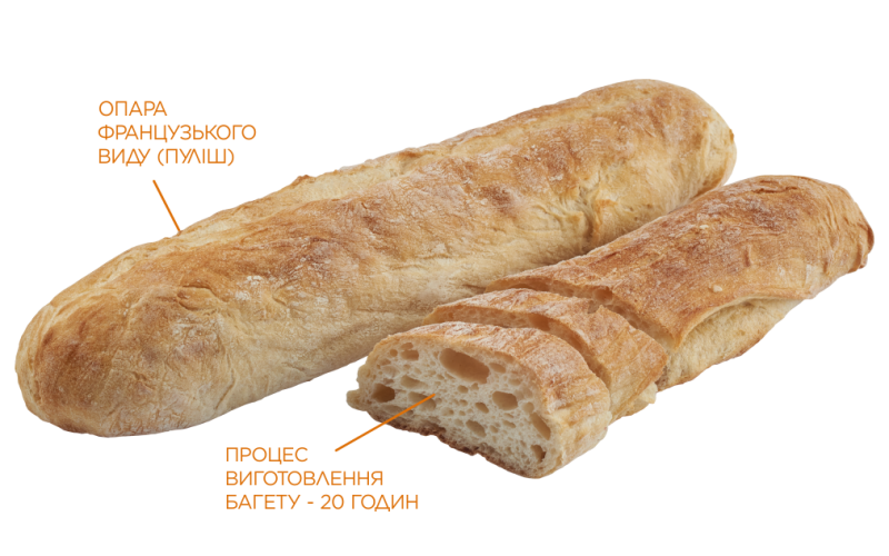 Наш французький багет створений з дотриманням традиційних французьких технологій. В його основі рідка холодна опара – пуліш, тож процес виготовлення наших французьких багетів займає близько 20 годин. Пуліш робить багет надзвичайно хрустким, пористим і рустикальним, як у традиційних перкарнях Франції.