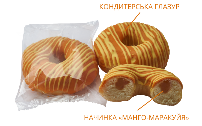 Донат з насиченим смаком екзотичних фруктів: солодке манго, з легкою кислинкою маракуйї. Кожен ніжний вкус — це подорож у тропічний рай, в якому начинка розкриває неперевершену гармонію смаків, пробуджуючи відчуття справжнього задоволення.