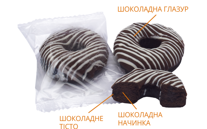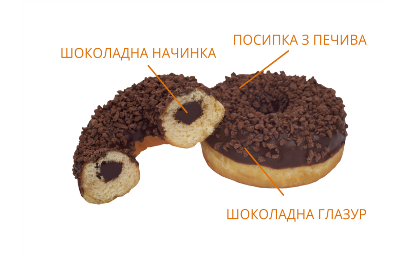 Донат вкритий глазур'ю та наповнений м'якою шоколадною начинкою, поєднує в собі солодкість та глибокий смак какао.