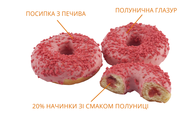Але це ще не все! Донат прикрашений цукровим печивом, що додає йому неперевершену текстуру і грацію. Кожен ковзкий шар печива розтає на вашому язику, створюючи гармонійний дует з полуничною начинкою.