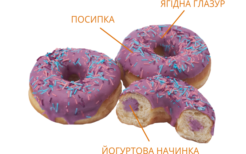 Ніжний донат зі смаком ягідного йогурту створений, щоб робити ваші миті солодшими і незабутніми. Кожен укус переповнений йогуртовою начинкою з насиченим смаком ягід, яка тане в роті, підкреслюючи свіжість і елегантність цього десерту.