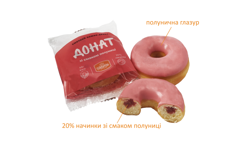 "Трендовий десерт зі справжнім літнім смаком. Ніжне пухке тісто чудово поєднується з начинкою зі смаком соковитої полуниці. Стильна рожева полунична помадка ідеально доповнює візуал трендового ягідного смаколика. Рекомендуємо «Донат зі смаком полуниці» до улюбленої гарячої кави!"