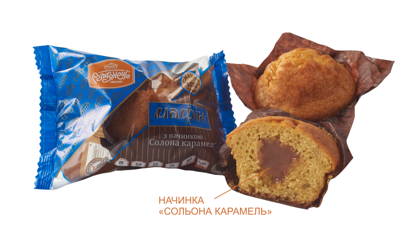 Мафін з начинкою солоної карамелі поєднує в собі солодкість та ніжність тіста з несподіваною солоною ноткою начинки. Цей десерт чарує гармонією смаків: від шовковистого мафіна до неповторного відтінку карамелі, який підкреслюється натяком на сіль.