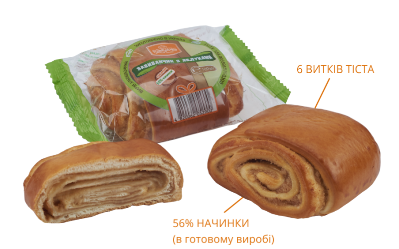 Класика української здоби – завиванець з ароматними яблуками. Ми замішуємо тісто за традиційною рецептурою, як колись випікали в кожній українській господі. В основі начинки – поєднання соковитих стиглих яблук і солодкого яблучного повидла. Вдосконалене нашими майстрами обладнання, дозволяє зробити шість тоненьких завиточків і досягнути ідеального балансу тіста та начинки.