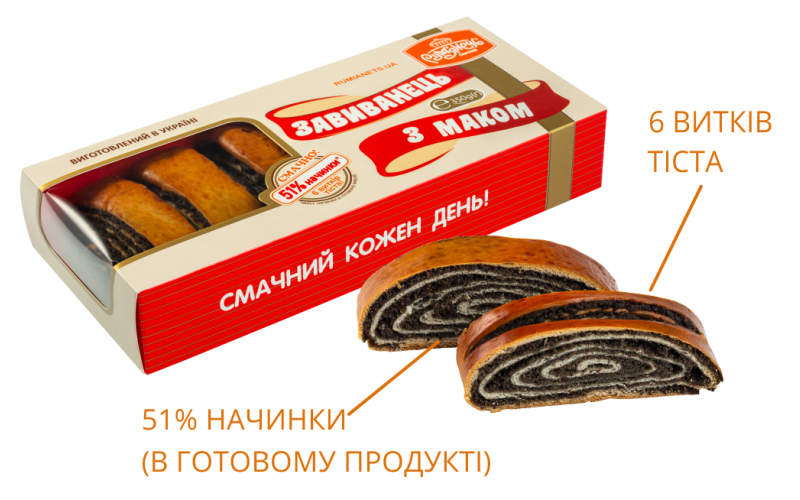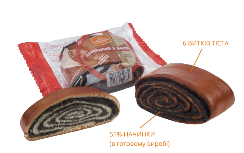Ваш улюблений завиванець з маком у зручному форматі to go. Традиційне смачне пухкеньке тісто та дуже багато макової начинки. Цей завиванчик відмінно смакує з улюбленими чаєм, кавою, йогуртом чи фрешем. Ідеальна вага – 100 грамів у зручному індивідуальному пакуванні. Такий завиванчик – чудовий варіант смачного перекусу за будь-яких мов.