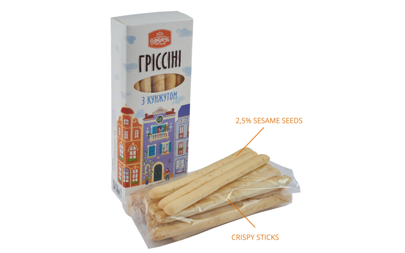 Perfectly dried thin Grissini sticks with sesame seeds. While baking, sesame reveals its taste in a special way. Thanks to sesame seeds these Grissini sticks have a subtle nutty flavor. Breadsticks with sesame seeds make a perfect match to the first courses and salads, or as a tasty snack alone.