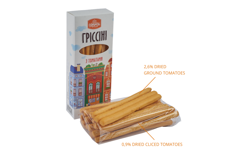 Perfectly dried Grissini sticks with a delicate tomato flavor and a bit spiced with pepper, like true Italian temper. Thanks to the traditional baking technology these breadsticks are extremely light and crispy. These Grissini go well with a variety of soups. Due to the tomato aroma, they bring a new taste to well-known dishes.