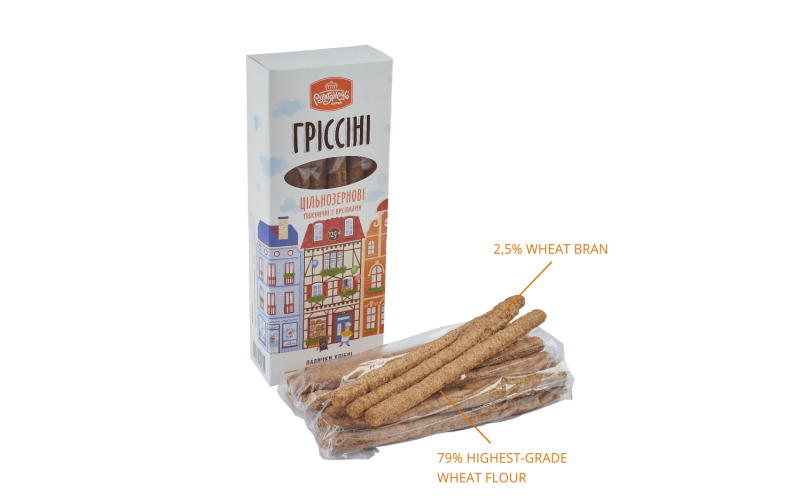 Traditional Italian grissini breadsticks are considered a healthy food when eaten in moderation and as a part of a balanced diet. We decided to create a perfect version of crispy breadsticks. These grissini are made with the highest quality whole grain flour and bran. This combination contains a large amount of vitamins and microelements necessary for the body. Grissini Breadsticks are a great option for a healthy snack. In addition, due to their delicate taste they perfectly complement any favourite dishes.