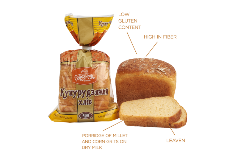 The specialty of our Corn Bread is that we bake it with the addition of real corn-millet porridge which is made with dry milk. In the form of cooked cereal corn grits and millet retain more useful properties, and thanks to a special recipe this bread is rich in fiber and has a low gluten content. Moreover, bread with cooked cereal has a distinct delicate corn creamy flavor which is loved by even the smallest customers.