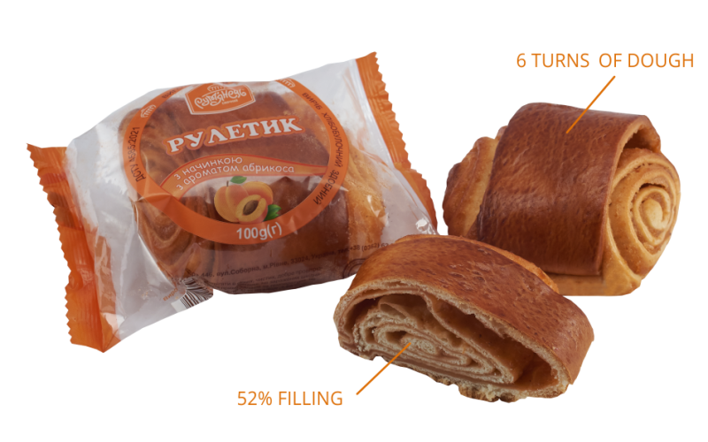 Apple Zavyvanets or Roll is a traditional Ukrainian pastry. These fancy cakes have authentic taste since we are preparing dough according to a traditional recipe which is well-known by nearly every Ukrainian housewife. The filling is made of combination of ripe juicy apples and sweet apple jam. The equipment modernized by our specialists allows to make six thin layers and reach a perfect balance of both dough and filling.