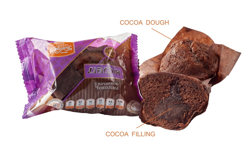 Chocolate muffins are one of the most popular desserts to accompany morning coffee or even to match your evening cup of tea, because it is hardly possible to resist such a sweet treat. It is a tender, airy sponge cake with a bright chocolate taste. We add a bit of dry milk into our muffins that balances the cholate flavor and brings them a special delicate cocoa aroma.