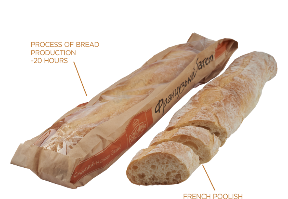 Our French Baguette is baked in accordance with traditional French baking techniques. It is made with a fluid leavened dough – poolish, so the process of making our baguettes takes about 20 hours. Poolish enables to get extra crispy baguettes, porous and rustic, just like in traditional French bakeries.