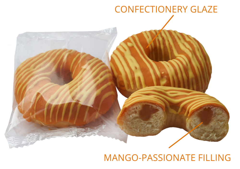 Ingredients: highest-grade wheat flour, mix for doughnuts (15%), mango-passionate filling, yeast, sugar, margarine, eggs, water, sugar powder.