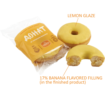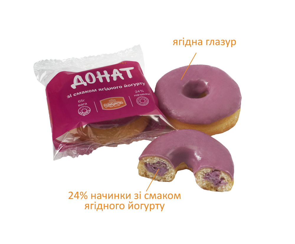 Ingredients: highest-grade wheat flour, mix for doughnuts (15%), "Сhocolina Burgundy with berry yogurt flavor" (24%), yeast, sugar, margarine, eggs, water, sugar powder.