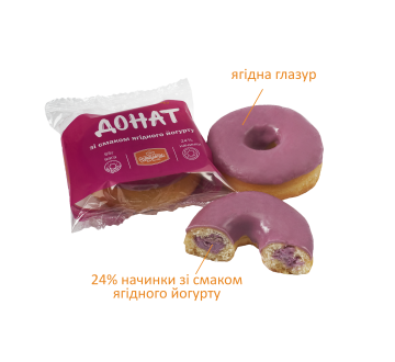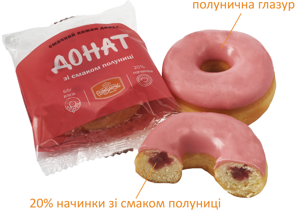 Ingredients: highest-grade wheat flour, mix for doughnuts (15%), strawberry -flavored filling (20%), yeast, sugar, margarine, eggs, water, sugar powder.