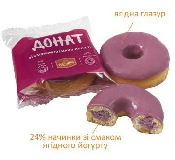 Ingredients: highest-grade wheat flour, mix for doughnuts (15%), chocolate-flavored filling, yeast, sugar, margarine, eggs, water, sugar powder.