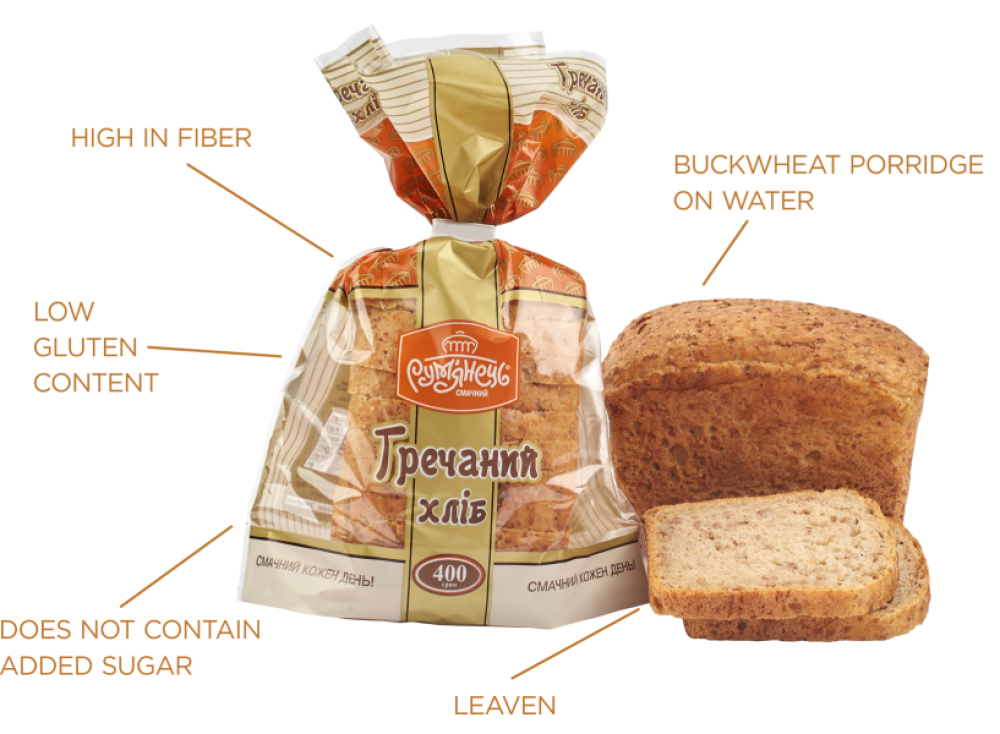 Ingredients: first-grade wheat flour, peeled rye flour, buckwheat, margarine, dry gluten, rye bread leaven, yeast, salt, water.