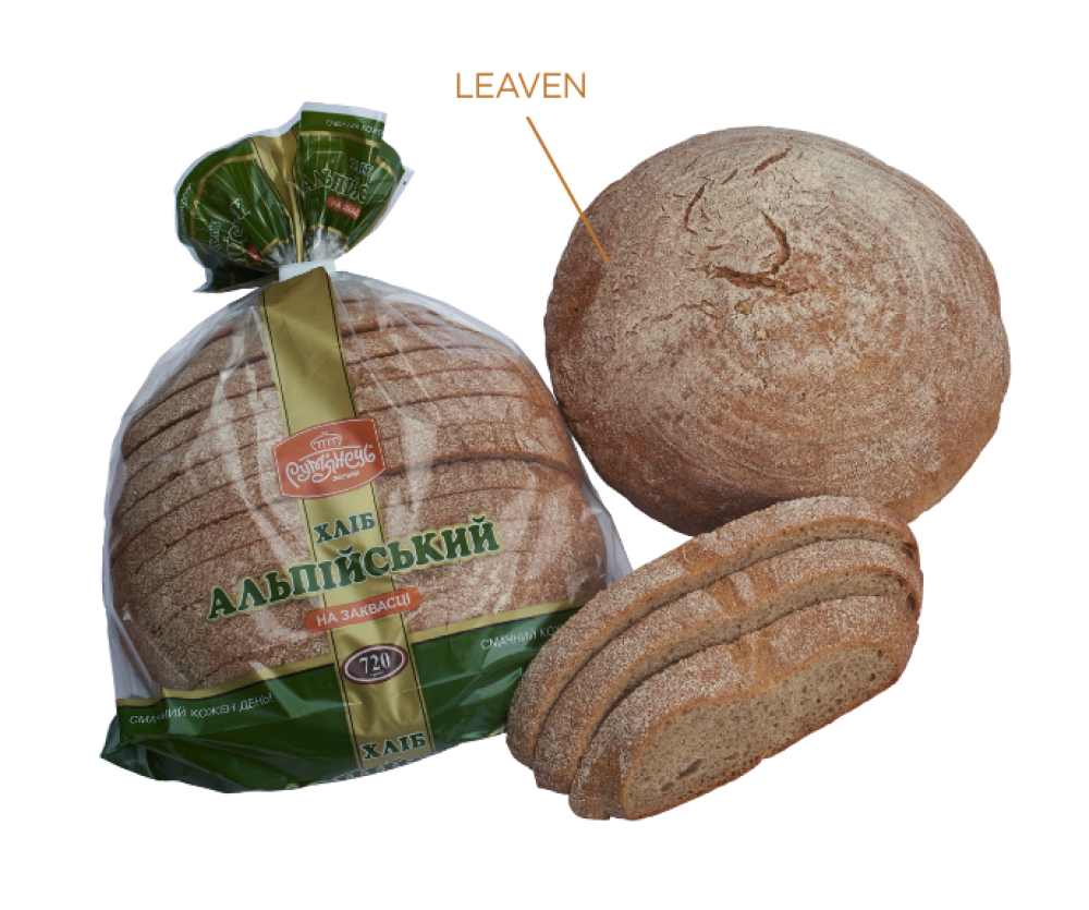The power of natural taste is hidden in a simple classic recipe. Traditional rye-wheat bread is made with active rye sourdough starter. We added just a pinch of salt to top-quality flour to enhance the bread taste. Due to sourdough starter, the natural benefits of each rye-wheat slice are reveled. Our ‘Alpiysky Bread’ has super fresh bread flavor and special appearance. Round loaves are a bit dusted with flour really remind of snowy peaks of the Alps.