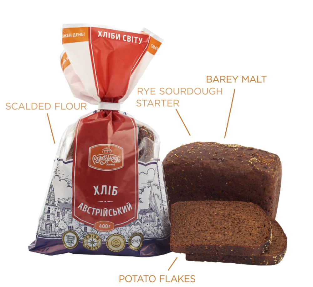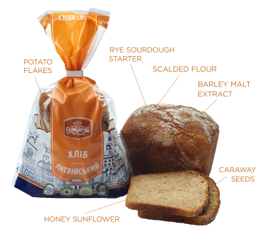 Ingredients: highest-grade wheat flour, drinking water, peeled rye flour, sugar-glucose syrup “Leipomo”, potato flakes, bread mix “Brownextra”, white sugar, compressed baker’s yeast, table salt, barley malt extract (dark), dry baked wheat gluten.
