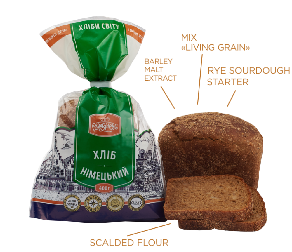 Bread made according to the authentic German formula has to be definitely included into our special ‘Bread of the World’ collection. The Germans love eating bread as well, so they can boast of variety of recipes, we chose to bake a special one. Our German Bread is a rye-wheat loaf, made with scalded flour and active rye sourdough starter. The German temper of this bread is exactly in addition of grains (pearl semolina, sunflower seed kernels, rye whole-grain flour, rye bran). Malt-barley extract not only enhances the beneficial properties of this bread, but also brings sweetish notes to its final taste.