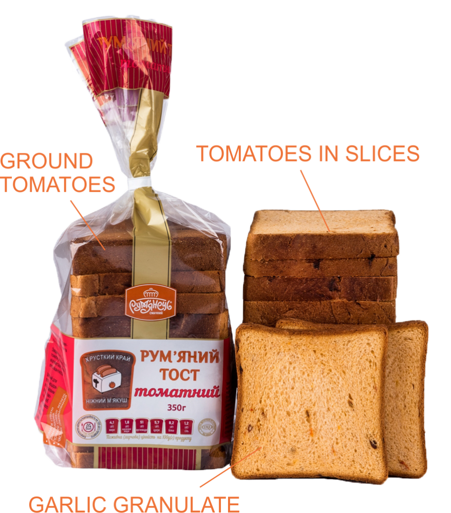 Ingredients: premium wheat flour, drinking water, dry baking mix (powdered sugar, dry wheat gluten, salt, wheat flour, emulsifiers mono and diglycerides of fatty acids, sodium stearyl lactylate, soy flour, wheat malt, antioxidant ascorbic acid, enzymes), margarine, spices dried tomatoes in pieces (3.95%), pressed baker's yeast, sugar, spices dried tomatoes ground (1.3%), granulated garlic.