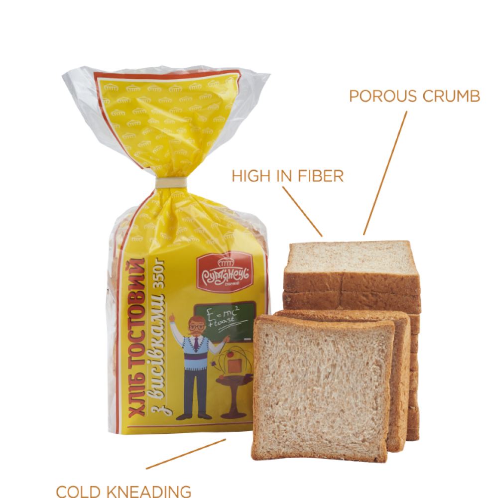 A glorious choice for tasty healthy breakfasts. We have our own baking technique for making toast bread. It is based on cold rise dough and a special way of shaping the loaves. That is why our toast breads have a fine-pored, elastic crumb and the thinnest soft crust. All slices have the right thickness and roast evenly in the toaster or on the pan and comes out perfectly crispy and aromatic. Wheat bran as an ingredient of this bread enriches it with fiber, so every toast brings maximum benefit.