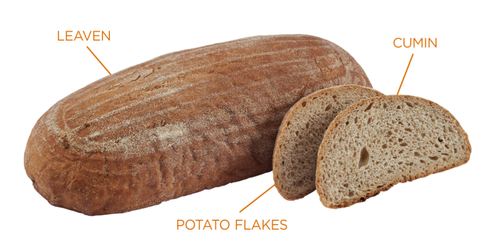 Ingredients: rye flour, first-grade wheat flour, rye leaven, yeast, salt, water, dehydrated potato flakes, caraway.