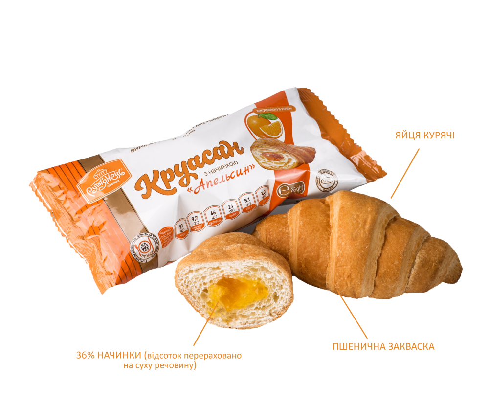 Ingredients: highest-grade wheat flour, water, filling “Orange” (36%), puff pastry margarine, sugar, milk margarine, compressed baker’s yeast, molasses (glucose syrup), table salt, baking improver, liquid wheat sourdough, vanillin