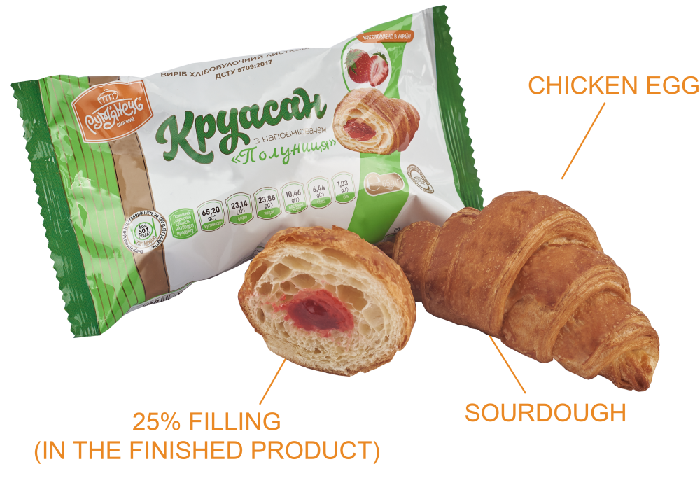 Ingredients: highest-grade wheat flour, water, filling “Strawberry” (25%), puff pastry margarine, sugar, milk margarine, compressed baker’s yeast, molasses (glucose syrup), table salt, baking improver, liquid wheat sourdough, vanillin.
