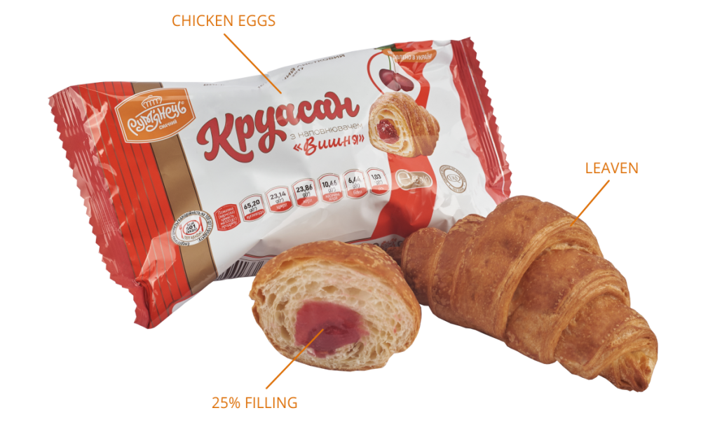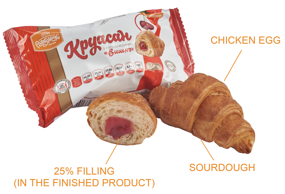 Ingredients: highest-grade wheat flour, water, filling “Cherry” (25%), puff pastry margarine, sugar, milk margarine, compressed baker’s yeast, molasses (glucose syrup), table salt, baking improver, liquid wheat sourdough, vanillin.