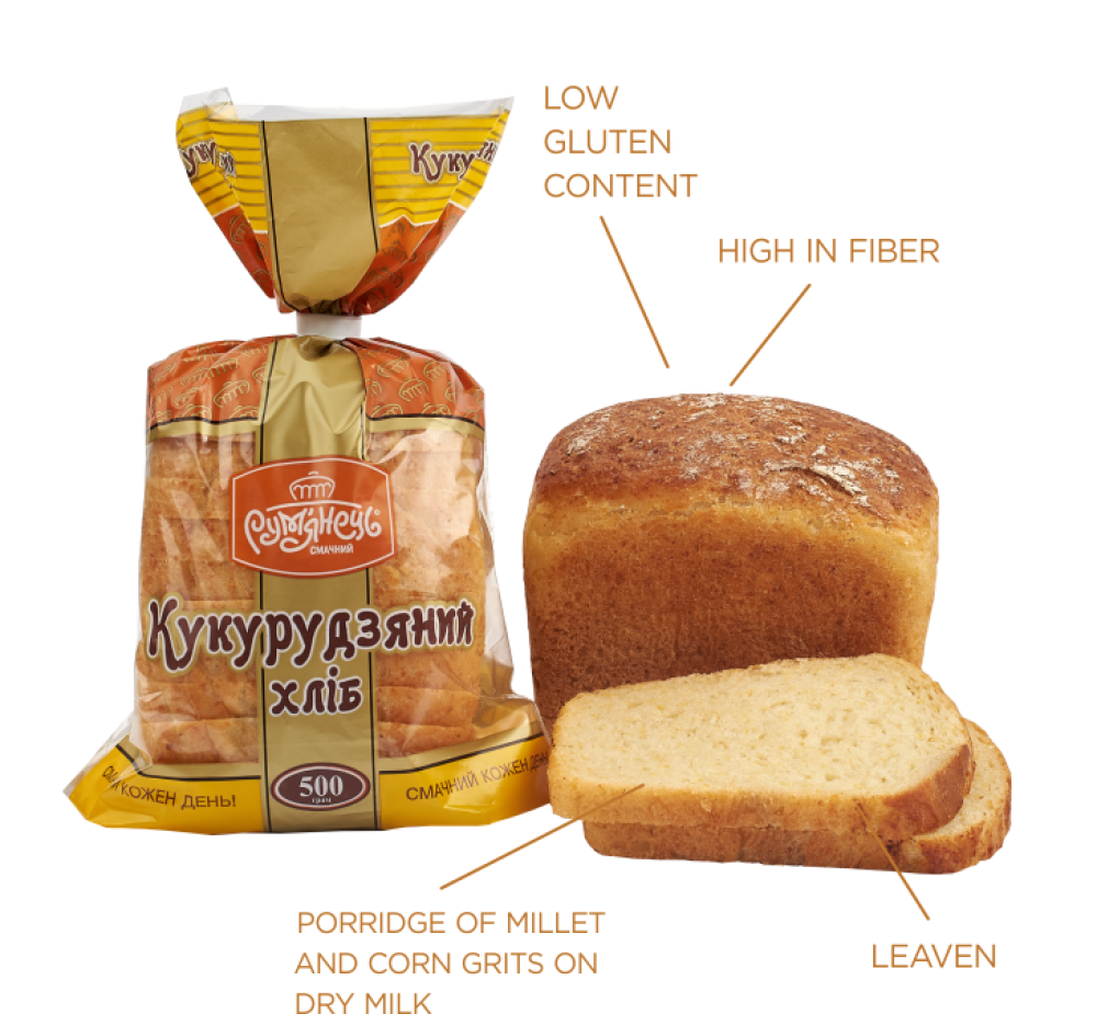 The specialty of our Corn Bread is that we bake it with the addition of real corn-millet porridge which is made with dry milk. In the form of cooked cereal corn grits and millet retain more useful properties, and thanks to a special recipe this bread is rich in fiber and has a low gluten content. Moreover, bread with cooked cereal has a distinct delicate corn creamy flavor which is loved by even the smallest customers.